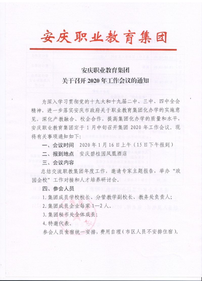 安慶職教集團擬定于2020年1月16日召開(kāi)集團2020年工作會(huì )議,請各參會(huì )單位填好會(huì )議回執(附表),于2020年1月10日上午12點(diǎn)前,發(fā)送至安慶職教集團秘書(shū)處郵箱:aqzjlm@163.com。參會(huì )回執見(jiàn)附件2。