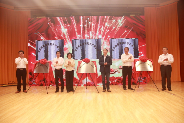 王愛(ài)武、汪時(shí)珍、畢明生及三個(gè)產(chǎn)業(yè)學(xué)院院長(cháng)為產(chǎn)業(yè)學(xué)院揭牌。
