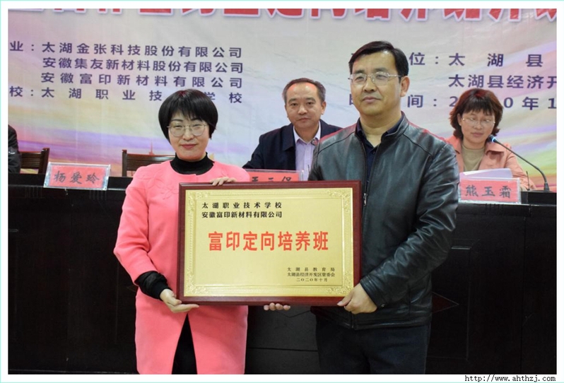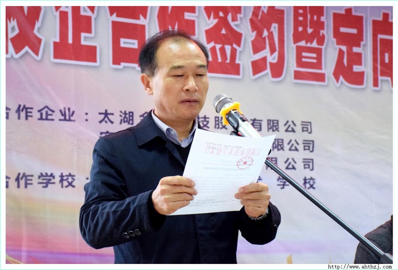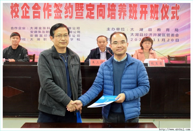 11月20日下午3點,校企合作簽約暨定向培養(yǎng)班開班儀式在太湖職校教學(xué)樓7樓會議室舉行,太湖縣教育局黨委書記、局長王三保出席儀式,開發(fā)區(qū)集友、金張和富印等三家企業(yè)的人力資源部門負(fù)責(zé)人,太湖職校部分班子成員、相關(guān)處室負(fù)責(zé)同志、定向培養(yǎng)班班主任及學(xué)生參加儀式,儀式由縣教育局副局長熊玉霜主持。