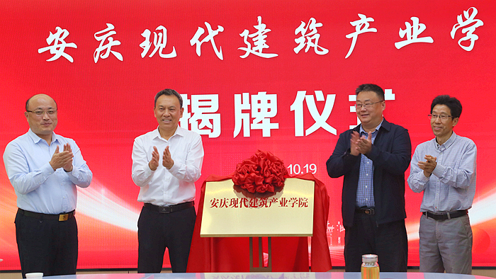 唐厚明、童宏葵、畢明生、謝長(cháng)兵共同為安慶現代建筑產(chǎn)業(yè)學(xué)院揭牌。