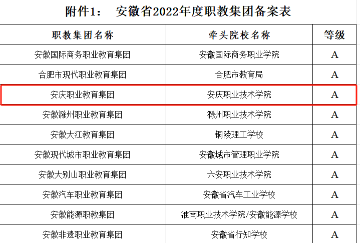 近日,安徽省教育廳、安徽省經(jīng)濟和信息化廳共同發(fā)出通報文件,安慶職教集團在全省57家職教集團2022年度工作運行情況綜合評價(jià)中,以總分第三名成績(jì)獲評安徽省A類(lèi)職教集團,實(shí)現連續五年榮獲安徽省A類(lèi)職教集團榮譽(yù)。