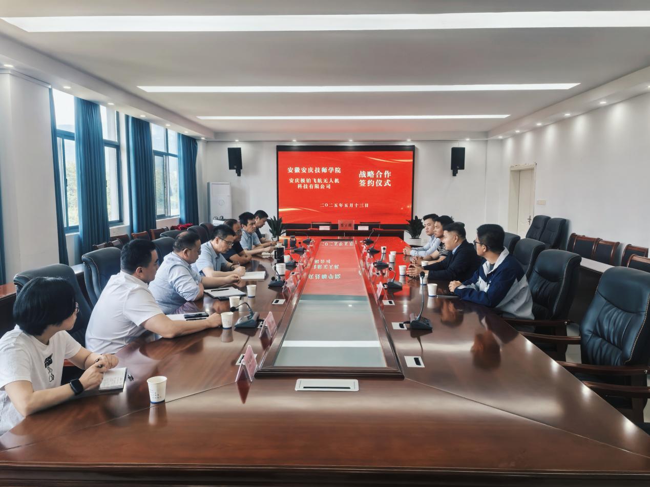 為推動(dòng)無(wú)人機技術(shù)領(lǐng)域高素質(zhì)人才培養,5月13日,安慶技師學(xué)院與安慶極鉑飛航無(wú)人機科技有限公司,正式簽署戰略合作協(xié)議,雙方將圍繞產(chǎn)教融合、人才共育等方向開(kāi)展深度合作,共同探索無(wú)人機技術(shù)應用領(lǐng)域的創(chuàng )新發(fā)展路徑。學(xué)院黨委副書(shū)記、院長(cháng)徐英武攜院領(lǐng)導班子成員及相關(guān)部門(mén)負責人,安慶極鉑飛航無(wú)人機科技有限公司總經(jīng)理胡應日攜相關(guān)部門(mén)負責人,出席此次簽約儀式。